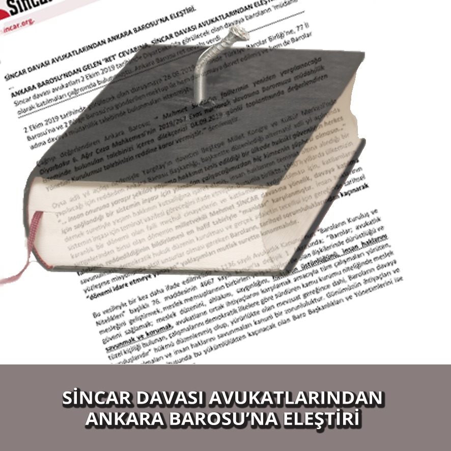 Sincar davası avukatları 2 Ekim 2019 tarihinde Diyarbakır’da görülecek olan davaya baroların ‘müdahil’ olarak katılmaları çağrısında bulunmuştu. Ankara Barosu ret cevabı verdi.